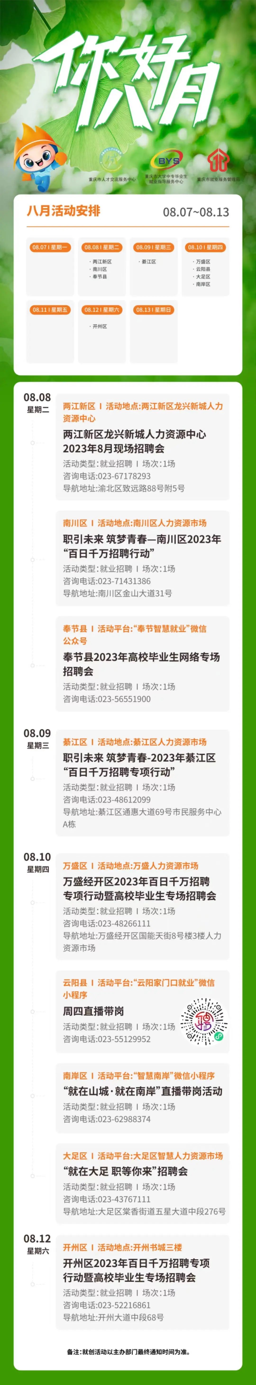 下周,全市共9场大学生就业创业活动。其中包括“百日千万招聘专项行动”、“就在大足 职等你来”招聘会、周四直播带岗等活动,欢迎大家踊跃参加!